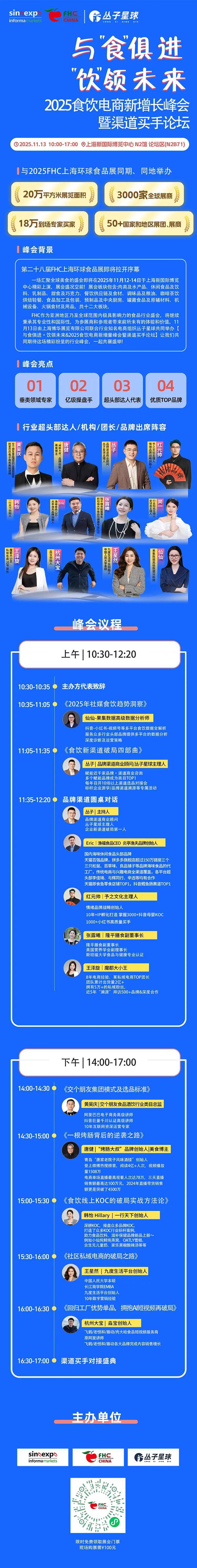 作为行业趋势的“思想策源地”,2025 FHC同期举办近20场前沿高峰论坛,邀请品牌创始人、行业专家等意见领袖,聚焦零售、电商、餐饮等热点赛道,解读智慧零售转型、电商流量新逻辑等,助力食饮人捕捉市场增长新机会。