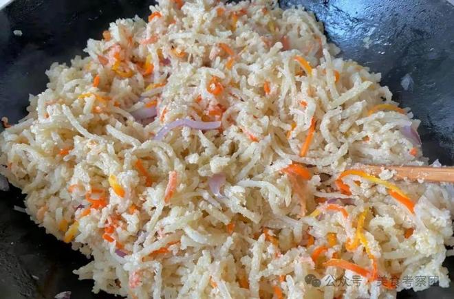 第一步:胡萝卜和土豆洗净切丝备用,这里要注意土豆一定要多清洗几次,将淀粉清洗干净第二步:胡萝卜丝和土豆丝中加入食盐,腌制十分钟,杀出水分。